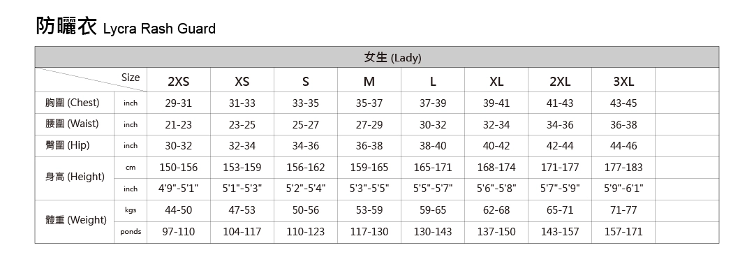 • 尺寸對照表